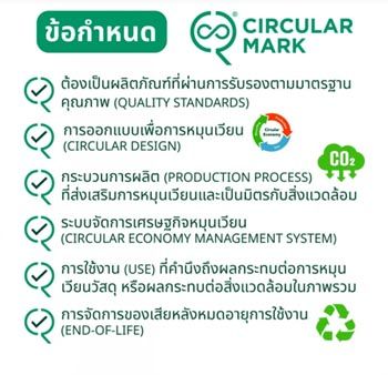 โดยผลิตภัณฑ์ติดฉลาก CIRCULAR MARK สามารถตอบโจทย์ รับเทรนด์ผู้บริโภคหรือผู้ซื้อสายกรีนที่กำลังมองหาสินค้าที่เป็นมิตรต่อสิ่งแวดล้อม เนื่องจากผลิตภัณฑ์ดังกล่าวบ่งชี้ได้ว่า 1.เป็นผลิตภัณฑ์หมุนเวียน 2.มีการออกแบบผลิตภัณฑ์และบรรจุภัณฑ์ที่คำนึงถึงการหมุนเวียนของวัสดุ 3.มีกระบวนการผลิตที่เป็นมิตรต่อสิ่งแวดล้อม 4.มีระบบการจัดการเศรษฐกิจหมุนเวียน5.มีคำแนะนำการใช้งานผลิตภัณฑ์อย่างเหมาะสมเพื่อยืดอายุการใช้งานให้นานที่สุด 6.มีคำแนะนำในการคัดแยกขยะ ตลอดจนรวบรวมของเสีย เพื่อนำกลับมาหมุนเวียน