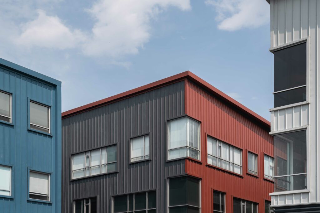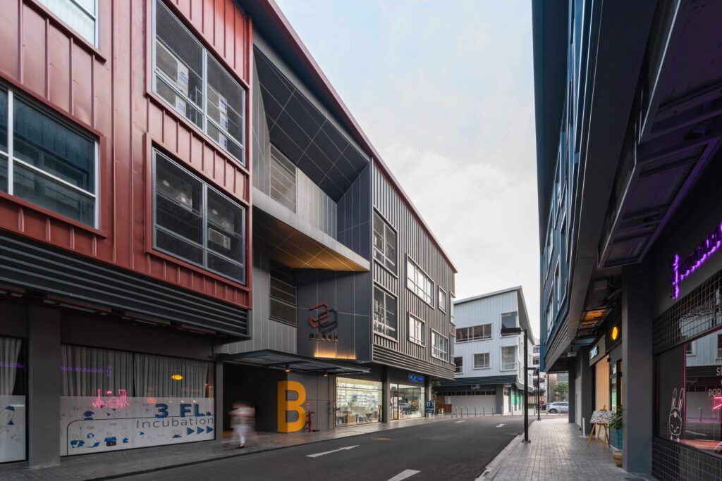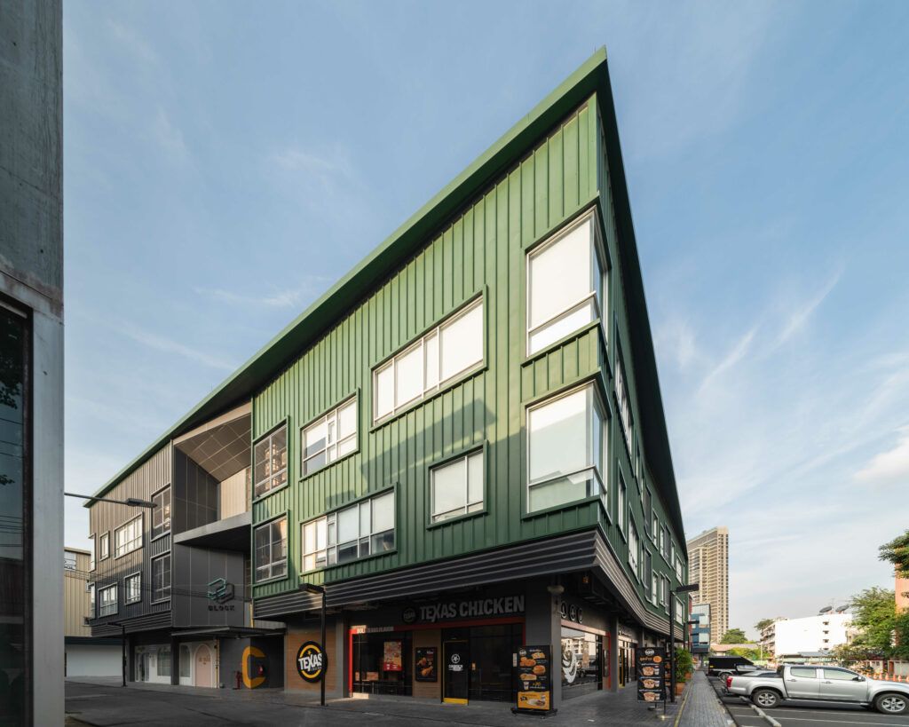 การออกแบบอาคารให้ความสำคัญกับระบบ Modular เพื่อประโยชน์ในเรื่องเวลา และวัสดุที่ต้องทำซ้ำ รวดเร็ว แนวคิดในการออกแบบอาคารจึงเป็นการจัดผังแบบเรียบง่ายโดยเป็นผังอาคาร สี่เหลี่ยมจัตุรัสที่มีการจัดการแยก พื้นที่พาณิชยกรรม สำนักงาน ทางสัญจร และพื้นที่ส่วนบริการอย่างตรงไปตรงมา การจัดผังอาคารของโครงการแบ่งพื้นที่อาคารเป็น 5 อาคารหลักและ 3 อาคารบริการย่อย ทั้ง 5 อาคารนี้ มีการจัดวางแปลนอาคารที่ใช้ชั้นล่างของอาคารเป็นส่วนของพื้นที่พาณิชย์และพื้นที่สำนักงานที่ชั้นบน 2 ชั้น อาคารถูกวางในรูปลักษณะของการเกาะกลุ่มและอยู่ไม่ห่างกันเพื่อง่ายต่อการสัญจรโดยมีพื้นที่จอดรถอยู่รอบๆอาคาร พื้นที่ภูมิทัศน์ถูกวางเป็นแกนหลักสำหรับการกำกับการจัดผังอาคารทั้ง 5 และใช้เป็นเส้นทางหลักในการสัญจร ของผู้คนในโครงการโดยได้มีการจัดวางต้นไม้ใหญ่พร้อมที่พักคอยที่ได้มีการออกแบบในรูปฟอร์มที่อ้างอิงมาจาก อาคารไว้สำหรับคนที่มาใช้บริการของโครงการ แกนพื้นที่ภูมิทัศน์นี้ได้ถูกนำมาใช้ในการกำหนดจุด Focus ของ อาคาร โดยผังอาคารจะมีการหมุนอาคารและบิดตัวอาคารเล็กน้อยเพื่อให้แต่ละอาคารมีจุด Focus ของตัวเองใน ทุกอาคาร