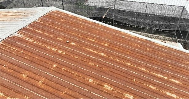 หลังคาเมทัลชีททั่วไปที่ไม่ได้คุณภาพ เมื่อใช้งานไปแล้ว 3 ปีเกิดสนิมแดง โดยในภาพจะเห็นว่าครอบจั๋วและครอบข้างที่ใช้เมทัลชีทบลูสโคปยังไม่เกิดสนิมแดง