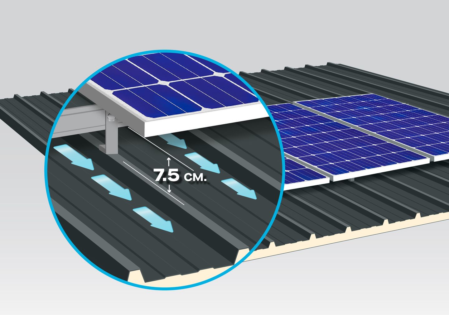 1. ช่องว่างระหว่างสันลอนหลังคาถึงระบบแผงโซล่าเซลล์ ควรมีความห่างมากกว่า 7.5 เซนติเมตร เพื่อลดการสะสมของใบไม้หรือสิ่งต่างๆ ที่จะมาติดอยู่ด้านล่างของแผงโซล่าเซลล์ รวมถึงเพื่อให้น้ำสามารถไหลผ่านหลังคาเมทัลชีทได้ เวลาฝนตกหรือระหว่างการล้างทำความสะอาด และลดโอกาสในการที่ลมจะพัดสอดเข้าใต้แผงโซล่าเซลล์แล้วทำให้แผงหลุดออกจากหลังคาและเกิดความเสียหายได้