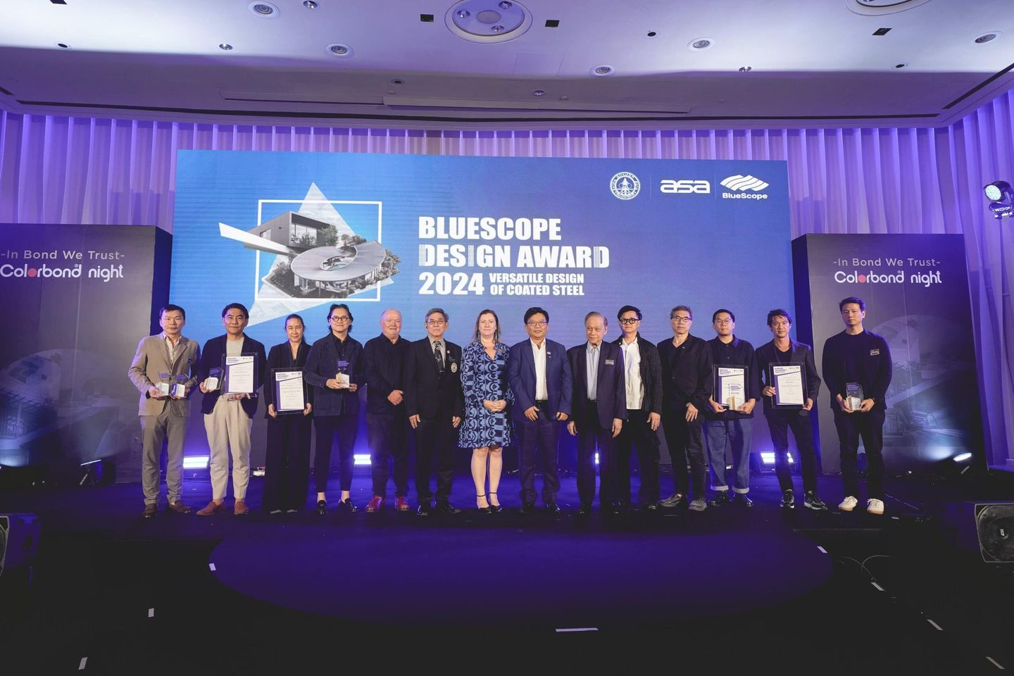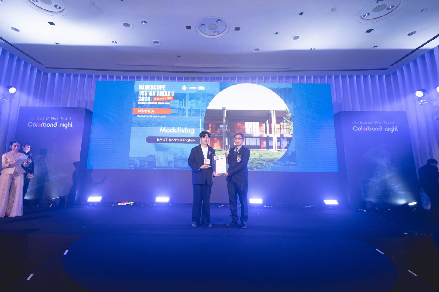 ภายในงานได้มีการมอบรางวัลให้แก่ผู้ชนะและผู้ผ่านเข้ารอบสุดท้าย งานประกวดอาคารยอดเยี่ยม BlueScope Design Award 2024 ซึ่งจัดขึ้นเป็นปีที่ 4 และ BlueScope Design Award The Next Gen งานประกวดการออกแบบบ้าน Multi-Functional House โดยนำ COLORBOND® steel มาใช้ในงานดีไซน์ที่หลากหลาย สำหรับระดับนิสิตนักศึกษา ซึ่งจัดขึ้นเป็นปีแรก