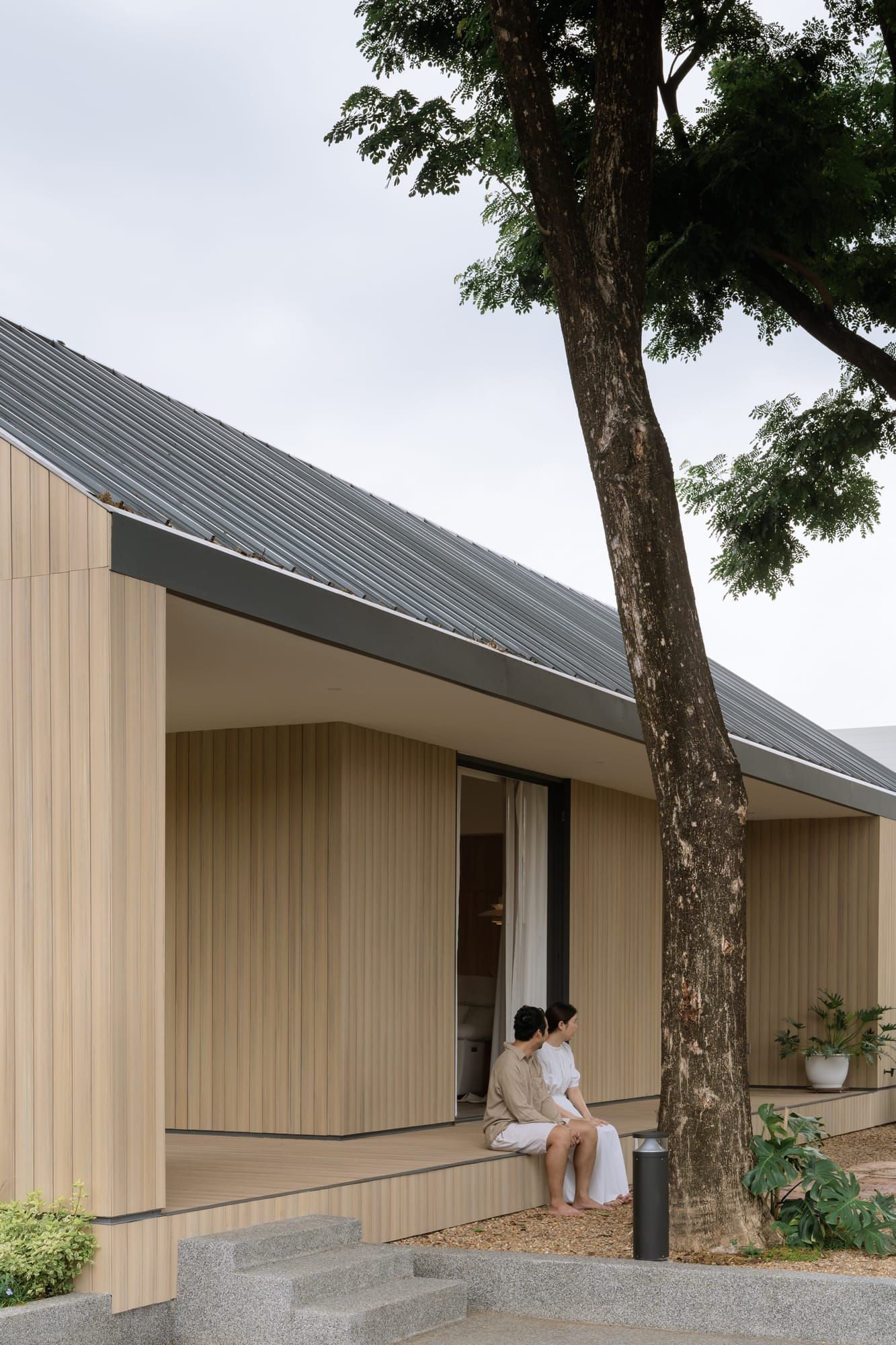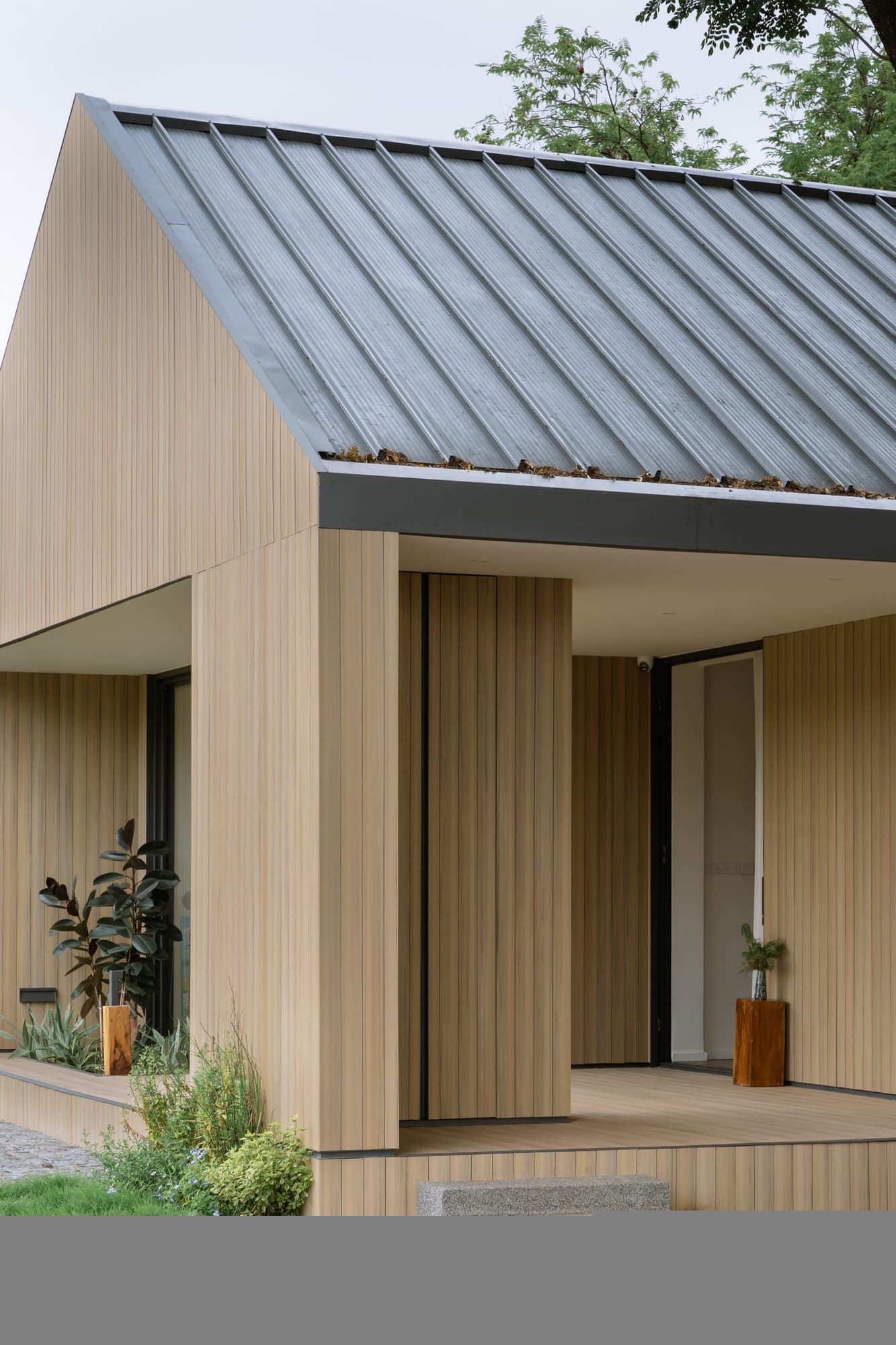 ที่มาของชื่อ Summer House เพราะเจ้าของบ้านชอบฤดูร้อน ชอบที่จะได้สัมผัสกับอากาศธรรมชาติ รวมไปถึงความโปร่งสบาย ที่ยังคงความเป็นส่วนตัว ซึ่งเป็นเหตุผลที่เจ้าของบ้านตัดสินใจที่จะไม่ทาหลังคาโรงจอดรถ โดยยินดีที่จะได้สัมผัสกับแดดและฝนบ้างเป็นบางคราวในการเดินเข้าบ้าน การเลือกใช้หลังคาก็เช่นเดียวกัน ด้วยความที่ตัวบ้านตั้งอยู่ใต้ต้นไม้ใหญ่ จึงมักมีเศษกิ่งไม้ตกใส่หลังคาอยู่บ่อยครั้ง หลังคาเมทัลชีทจึงตอบโจทย์เรื่องความทนทาน โดยเฉพาะตัวปิดขอบชายคาที่ยาวตลอดความยาวของตัวบ้าน จะต้องเลือกใช้แผ่นเมทัลชีทที่มีความหนาเหมาะสม เพื่อให้จบงานได้เรียบร้อย ไม่ดูบิดเป็นลอน เพราะเป็นส่วนที่มองเห็นได้ชัดเจน ซึ่งในแง่ดีไซน์ตัววัสดุก็ตอบโจทย์ที่สามารถออกแบบให้เป็นดีเทลเรียบกริบได้ ทาให้ดูทันสมัยและยังเป็นดูเข้ากับดีเทลการจบวัสดุไม้เทียมในส่วนอื่นๆของตัวบ้านที่เป็นเหล็กอีกด้วย